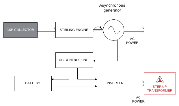 In CSP sunt utilizate oglinzi sau lentile pentru a concentra lumina solară într-un singur punct, cu scopul de a aduce lichidul la temperaturi ridicate (aproximativ 600 ° C).