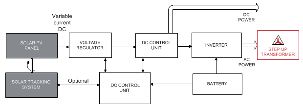 Acestea produc în mod direct curentul DC colectate la un invertor care convertește DC în. AC la o distribuție sau un convertor de înaltă eficiență transformator ridicător care transmite tensiunea medie de până la 36 kV la rețea. transformatoare înfășurări în aer liber sau în interior și multiple sunt utilizate pentru conectarea atunci când sunt instalate mai multe invertoare.