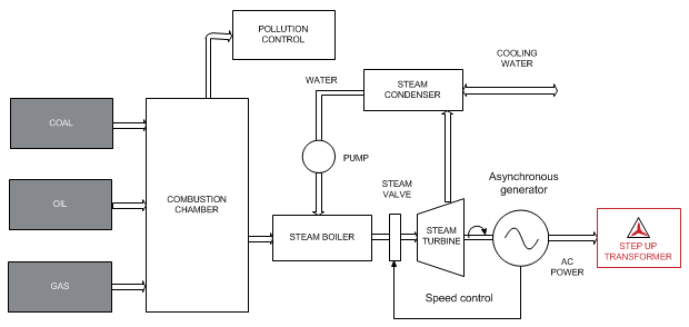 Principala diferenta in proiectarea unei termocentrale este datorata diferitelor resurse utilizate pentru incalzirea apei. Combustibilii fosili utilizati sunt:
